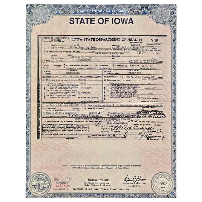 Every element—font style, size, letter spacing, and overall alignment—is faithfully reproduced using meticulous typesetting that mirrors the formatting standards of Iowa's vital records.